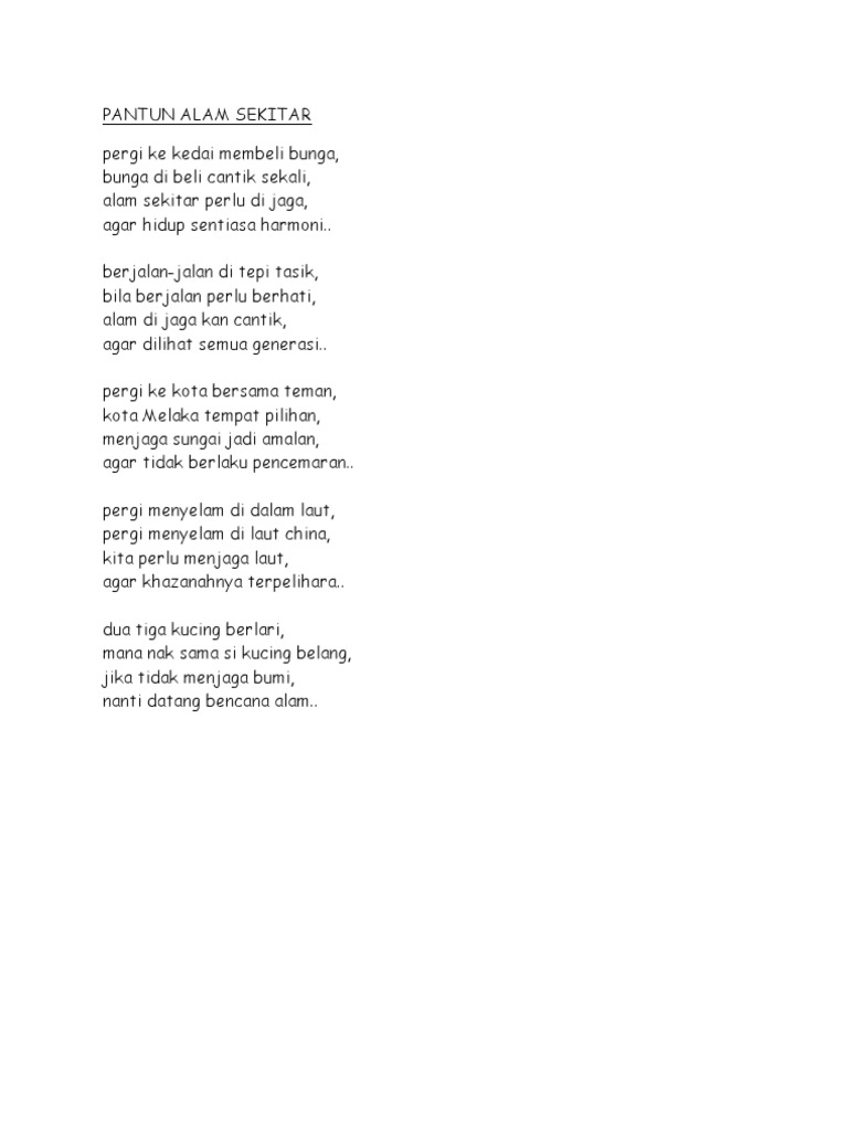 Pantun Alam Sekitar Dari emas biarlah permata Dalamnya digali berbatu-batu Alam ternoda didepan mata Masihkan saja di biar begitu. Agree to me the e-book will extremely song you further event to read. Hembus pawana bayu terasa Hati kehendak merasa sepi Indah buana ciptaan esa Mengapa tidak di jaga rapi Terang malam kerana bulan Pucuk paku delima batu Indah alam ciptaan tuhan Kemusnahan berlaku mengapa begitu.